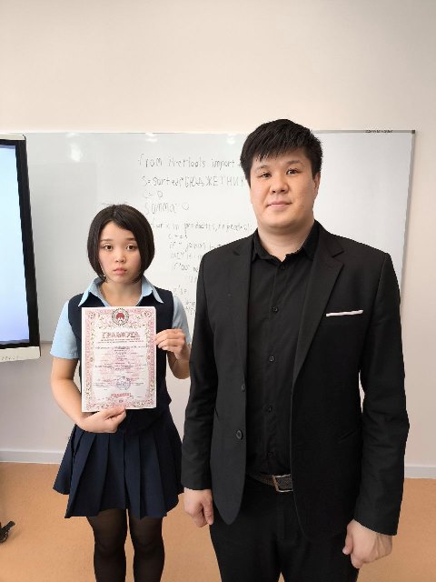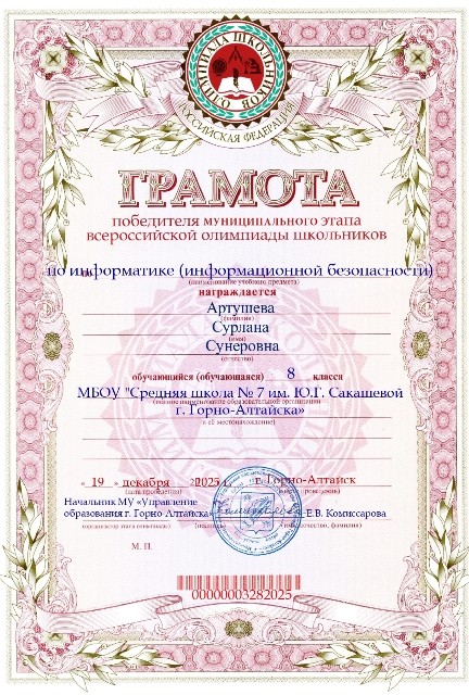| Информатика (ИБ) | Артушева Сурлана, 8а | Победитель | Бадыкин Денис Денисович |